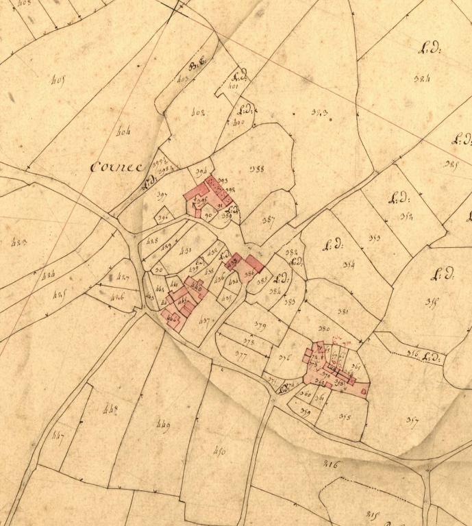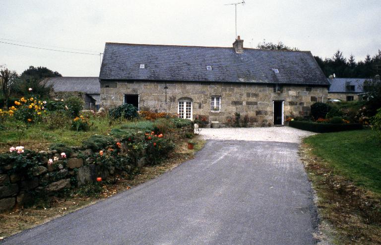 Maison en pierre de taille avec étage carré disparu. L'escalier en vis sans jour en granite était inclus dans une tourelle postérieure en demi hors-oeuvre (disparue). Sur la fenêtre, sont sculptés un calice (piédroit droit), les lettres IHS accompagnées des clous de la Passion et de la date (piédroit gauche) et l'inscription donnant le nom du commanditaire (linteau). A droite de la porte, une pierre noire pourrait être un charnier inséré dans le mur, comme sous la fenêtre se voyait en 1969 une évacuation d'évier. L'étable est séparée du logis par un mur de refends qui supporte la cheminée de la salle.