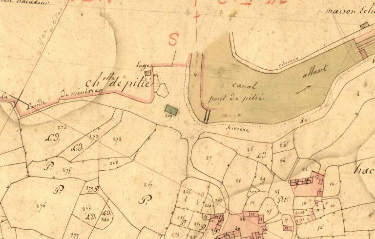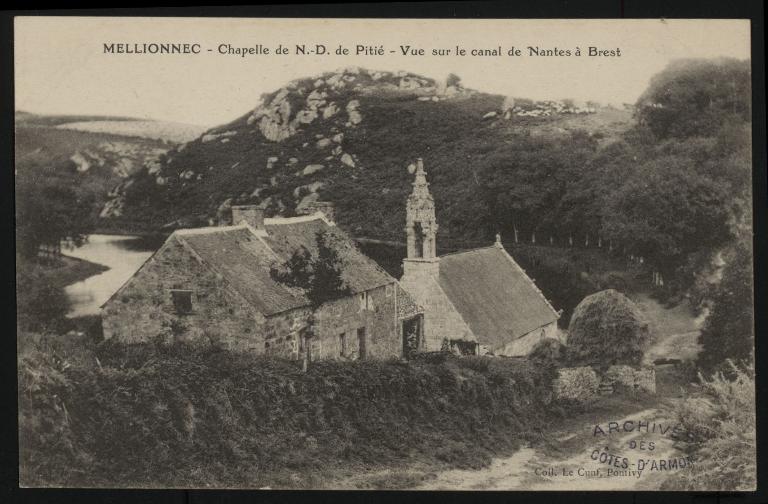 La chapelle Notre-Dame-de-Pitié (également dédiée à Saint-Gildas) est construite à la fin du 15 siècle, sans doute à l'initiative de la famille de Boutteville, possesseur de la puissante seigneurie de Coat Couraval en Glomel, toute proche : leurs armes pleines, à cinq fusées de gueules disposées en fasce, figurent sur l'élévation ouest et, en alliance avec une famille non identifiée, sur le clocher, comme à l'église paroissiale.