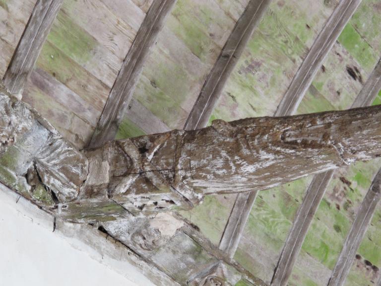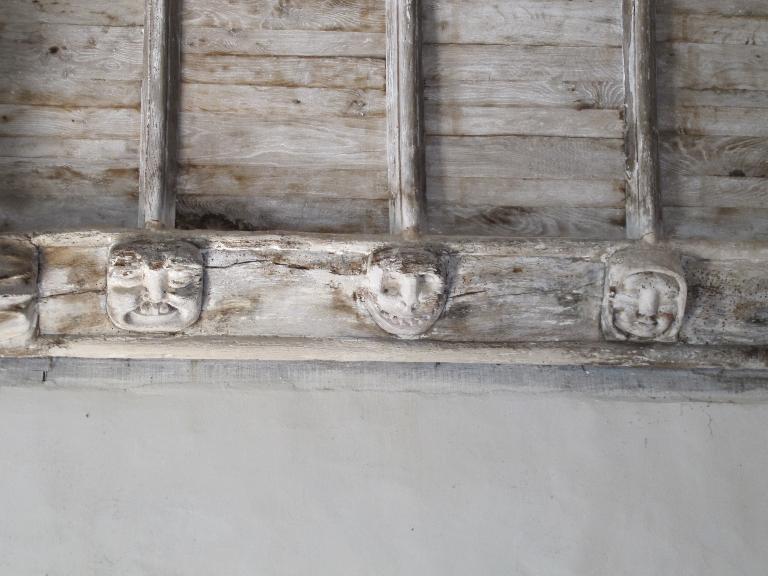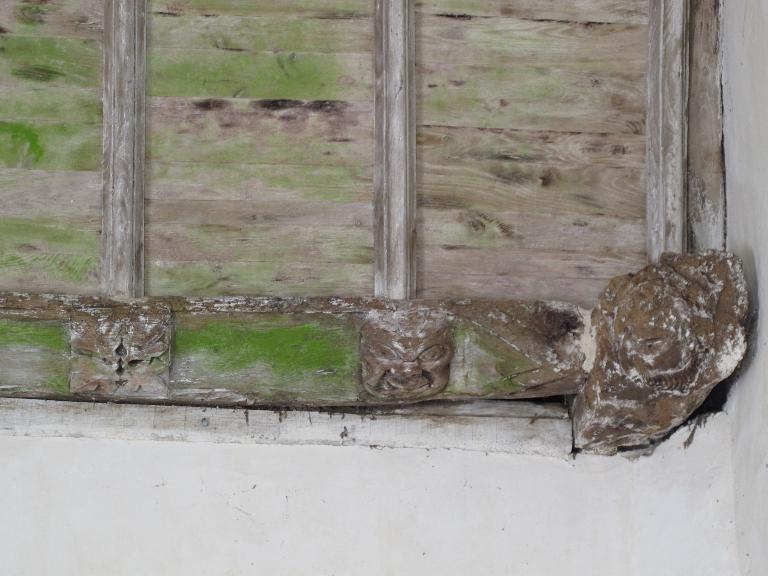 A l'intérieur, le vaisseau unique est recouvert d'une charpente à entraits à engoulants, sablières sculptées et lambris en berceau dont les nervure sont moulurées et les clefs pendantes sculptées de feuilles. La chapelle a conservé sa tribune ancienne.