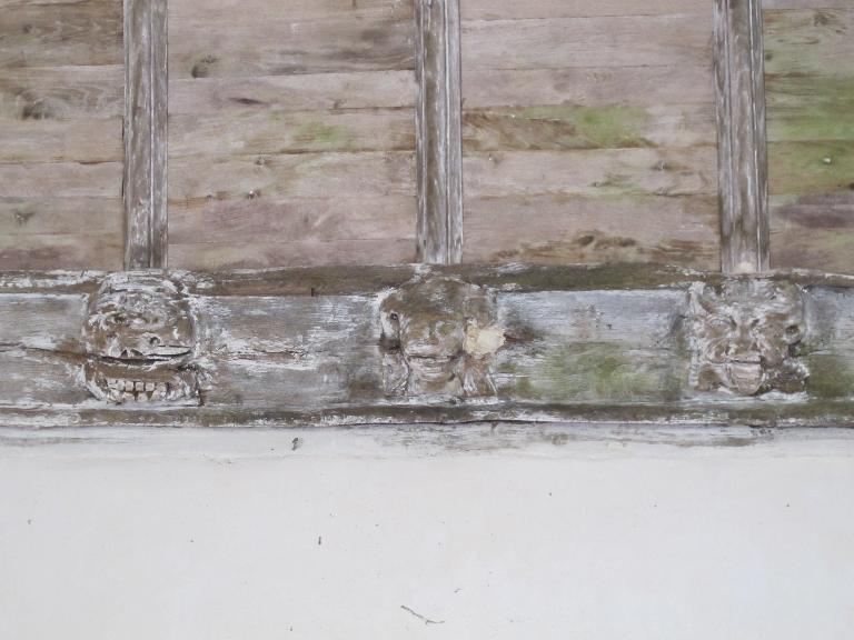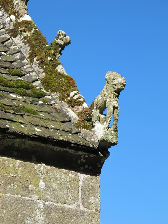Animaux fabuleux ou rééls (lion, chien) ornant les pierres d'assise des rampants Est et du rampant sud-ouest, ainsi que les angles du clocher.