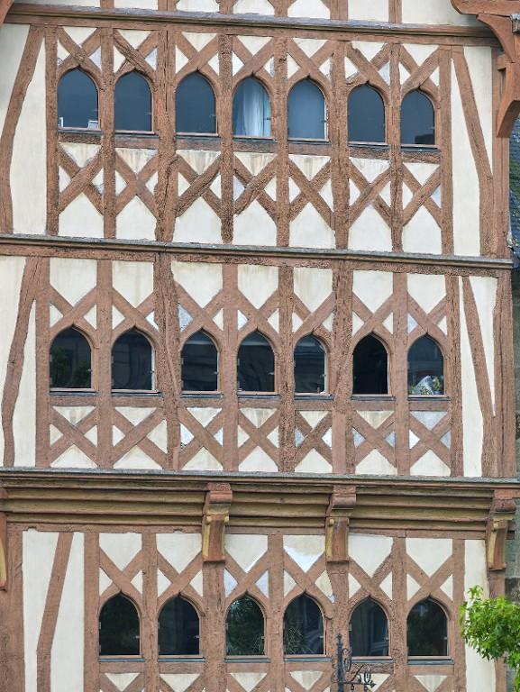 De nombreux bois ont été remplacés lors d'une restauration et la ferme débordante recréée. Une claire-voie de six baies aux linteaux en accolade est restituée au premier étage, contre sept au deuxième et troisième étage puis trois dans les combles. D'autres séries de petites fenêtres éclairent les étages du côté de la venelle. Des écharpes coudées assurent le contreventement à chaque extrémité des niveaux. Le gouttereau sud est en partie maçonné et comporte la tour d'escalier en son centre. Depuis la venelle, une porte en arc brisé ouvre sur la cour arrière.