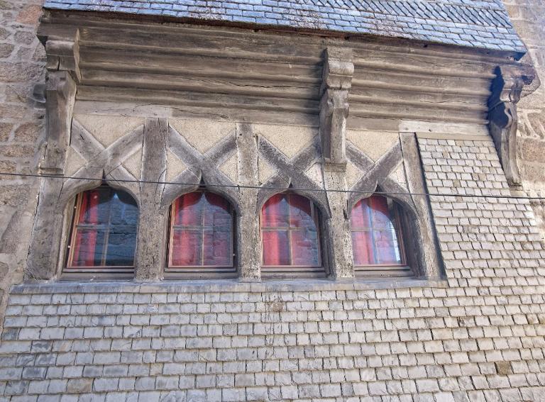 Les poteaux du rez-de-chaussée créent quatre ouvertures dont trois sur un mur-bahut remaçonné. Chaque baie est surmontée d'une accolade sculptée dans le linteau. Entretoises et sablières sont moulurées et les consoles sont sculptées d'un motif similaire au n°31 de la place. Au premier étage, un aisselier gravé des initiales R et I renforce l'angle et soutient le coyer. La ferme débordante du pignon présente un décor trilobé.