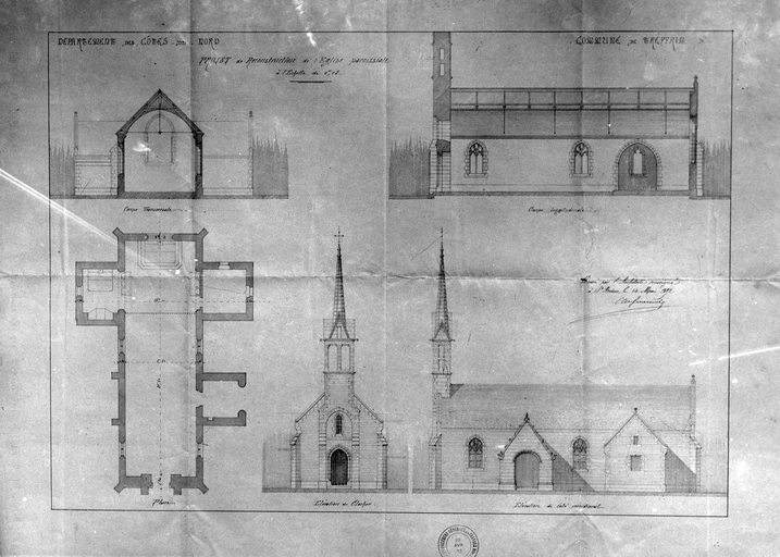 Chapelle construite vers 1580 ; ossuaire détruit vers 1893 ; porche porte la date 1582, marques de tâcheron ; édifice reconstruit par Le Guerranic en 1893, 1894. Actuellement église paroissiale Saint-Louis.
