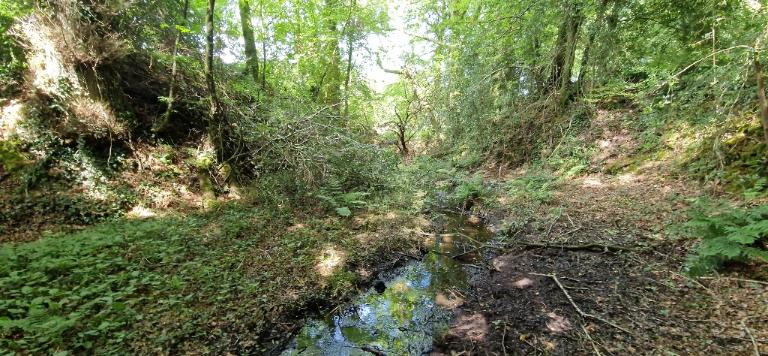 Le fossé est partiellement en eau, il mesure environ 12 m de largeur.