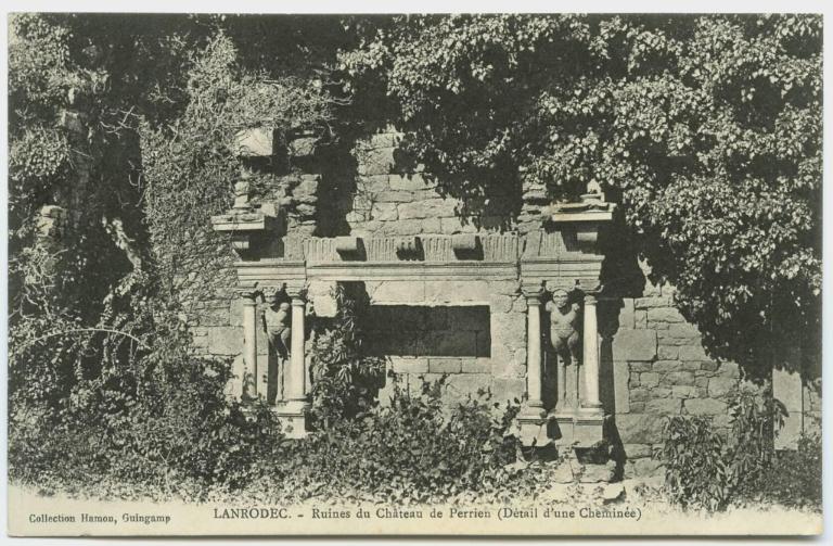 Au début du 20e siècle, le logis du château Renaissance de Perrien comporte encore des élévations importantes. La cheminée à cariatides est photographiée dans son écrin végétal. Elle est ornée de quatre colonnes sur piédestal avec chapiteaux et de deux satyres - mâle et femelle - faisant cariatides sommées chacune d’un chapiteau ionique.