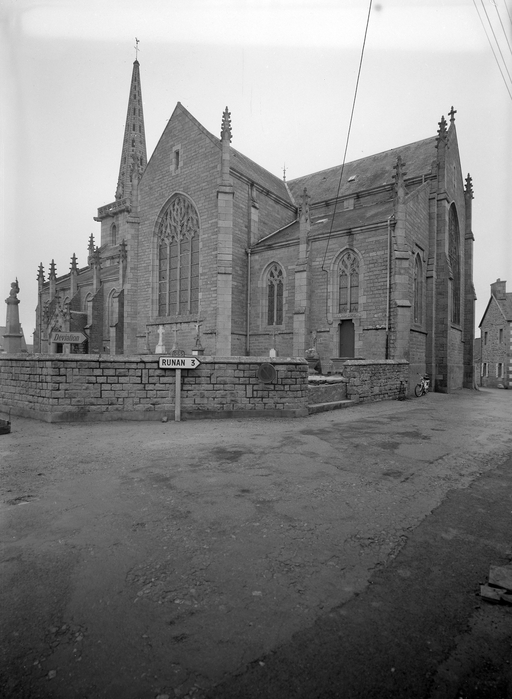 Clocher construit de 1857 à 1861 par Alain Daniel ; reste de l'édifice de 1895 à 1897 par Le Guerranic.