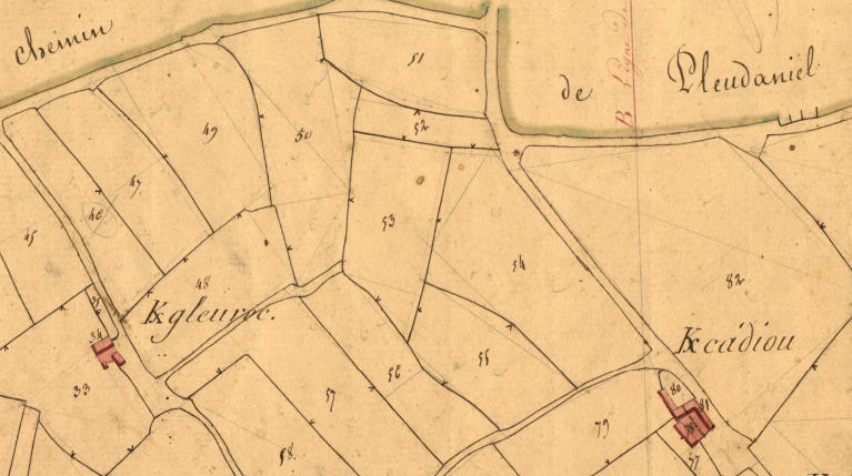 Série 3 P. Fonds du cadastre ancien. Tableau d'assemblage et plans parcellaires de la commune de Pleudaniel, 1829.