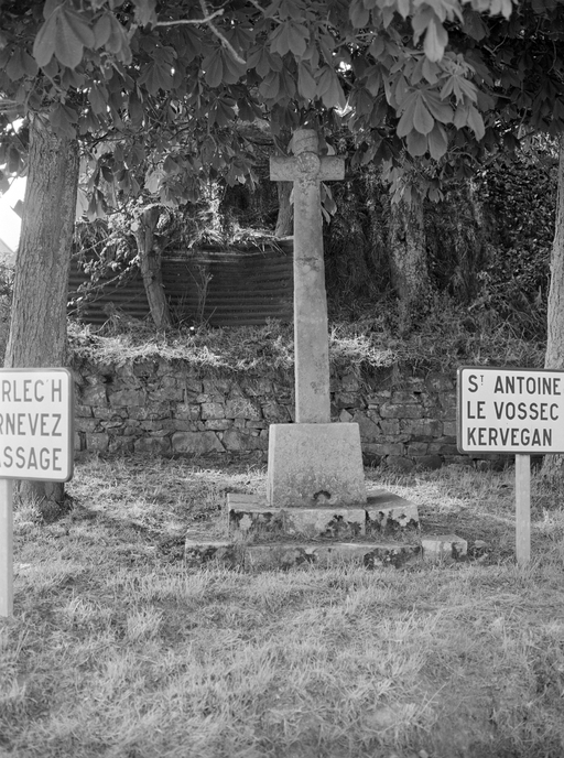 - Croix de Croas Peuillard :Cette croix située près du bourg, au croisement de deux chemins, mesure environ 2 mètres 70 et est édifiée en granite. Elle prend place sur un socle cubique lui-même surélevé par un emmarchement à deux degrés. La base du fût est de section carrée tandis que sa partie supérieure et le croisillon sont de section circulaire. La face nord du socle porte la date 1868 ce qui ne correspond pas à la datation du fût et du croisillon, sculpté d’une couronne d’épine, qui semblent antérieures. Présence du titulus portant le terme INRI du latin Iesvs Nazarenvs, Rex Ivdæorvm signifiant : « Jésus de Nazareth, roi des Juifs ».