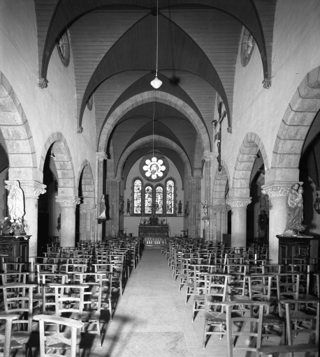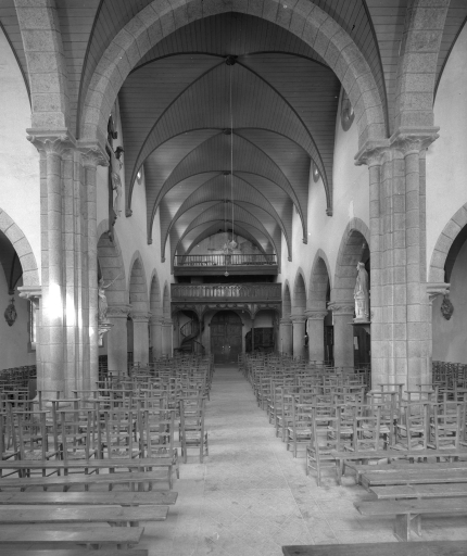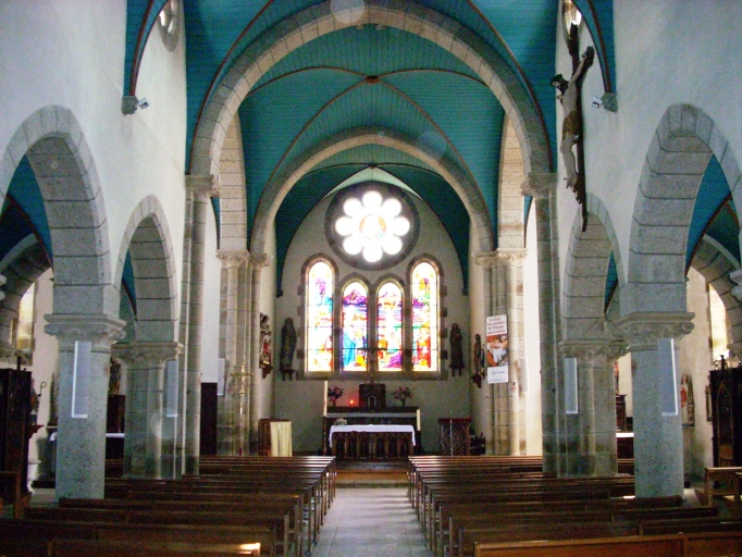 Plan en croix latine à trois vaisseaux. Chevet plat. Porche sud hors-œuvre. Clocher hors-œuvre à galerie et à chambre de cloches amortie par un dôme entouré d'une balustrade. Gros œuvre en moellon de granite enduit, à l'exception des encadrements des baies, des chaînages d'angles et du massif occidental, en pierre de taille de granite. Nef à cinq travées, éclairée par des fenêtres hautes et séparée des bas-côtés par des arcades en arc brisé reposant sur des chapiteaux à motifs floraux des colonnes. Deux tribunes superposées à l'ouest. Lambris de couvrement peint en bleu et les voussures en marron. Sol couvert de ciment.