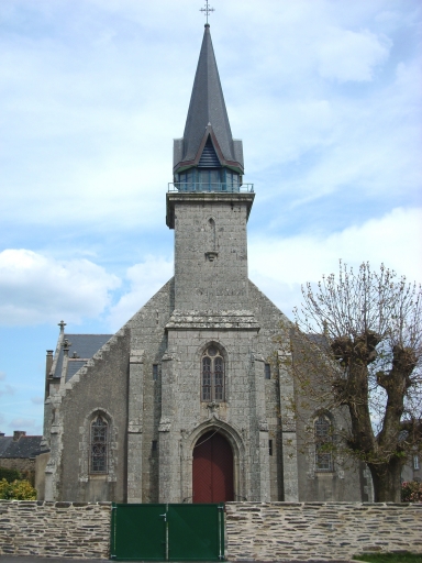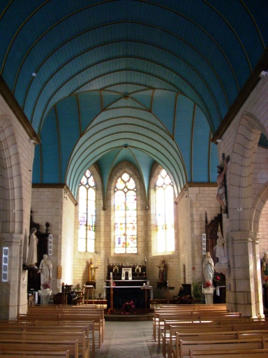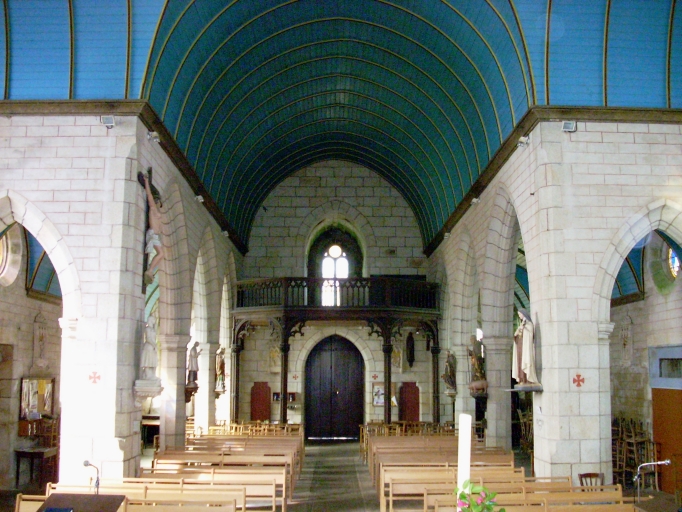 Edifice de plan en croix latine, avec trois vaisseaux à trois travées. Gros œuvre en moellon de schiste, enduit partiellement, à l´exception des chaînages d´angle, du massif occidental portant tribune et des encadrements des baies, en pierre de taille de granite. Chœur polygonal et chevet à noues multiples flanqué au nord d´une sacristie de plan hexagonal. Remploi du porche sud dans-œuvre du 17e siècle. Nef couverte de lambris peint en bleu, avec voussures en ocre et en jaune. Arcades en arc brisé reposant sur les chapiteaux des piliers octogonaux. Sol couvert de ciment.