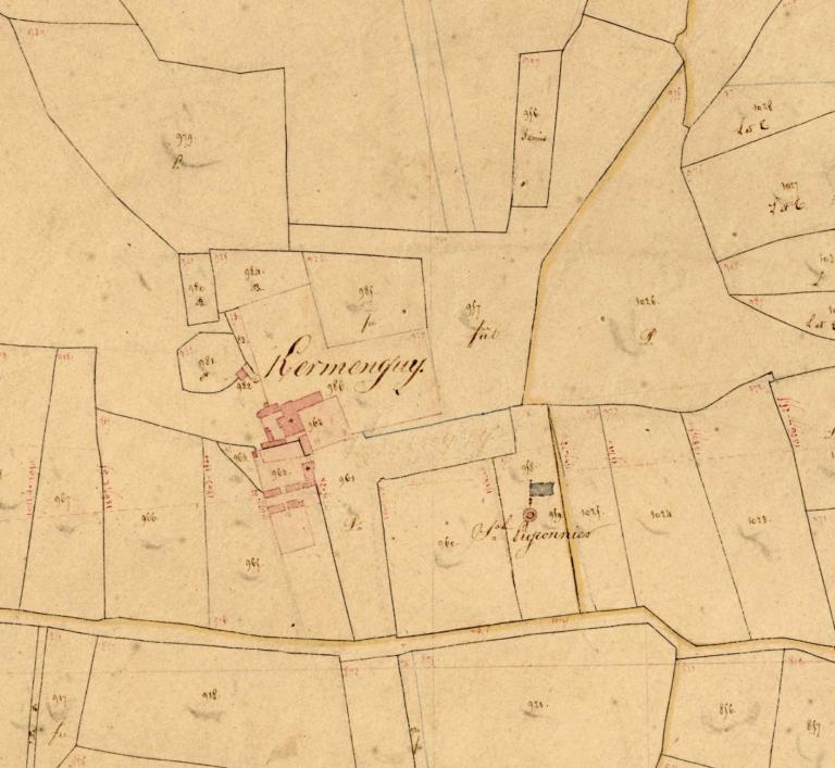 L’étude des micro-toponymes des parcelles et des natures de propriété, à partir du cadastre de 1829 conservé aux Archives départementales du Finistère, permet d’enrichir les connaissances sur le domaine de Kermenguy : Valy Saint Yan, vali, bali, la rabine, l’allée Sud plantée d’arbres dite allée Saint-Jean (parcelle n° 919), Parc ar Castel, park, au sens de "champ clos du château" (parcelles n° 920 et 921), Coat deru, le bois de chêne (parcelle n° 952 en futaie), Coat Nevez, le bois neuf (parcelle n° 954 en lande), Valy : l’allée Nord (parcelle n° 953 en pâture), Vagueres, maguérès, la pépinière (parcelle n° 956 en semis), Palest, palez [?], le palais (parcelle n° 957 en futaie ; parcelle n° 961 en pâture), Liors ar houdry, liorzh ar kouldry, le jardin clos du colombier (parcelle n° 957 en terre labourable), maisons et dépendances (parcelles n° 962 et 963), Jardin ar couch, kouarc'h, jardin du chanvre (parcelle n° 964, courtil), Parc ar verges, champ clos du verger (parcelle n° 965 et 966), Parc ar porc’hel, porc'hell, champs clos du petit cochon (parcelles n° 967 et 968), Foennec ar rivier, la prairie de foin ou pâture de la rivière (parcelle n° 979), Foennec bihan, la petite prairie de foin (parcelle n° 981 en pré), Buanderie (parcelle n° 982), etc.
