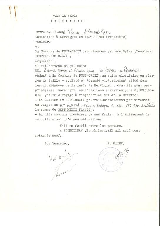 Le bureau municipal valide le choix puisque, le 4 avril 1969, l’acte de vente du puits est signé. Les frères Thomas et Jean Briand, domiciliés à Kervigen, vendent leur puits pour la somme de 7 000 F. à Henri Bonthonneau, maire, à charge pour la commune de l’enlever à ses frais et de procéder à son obturation.