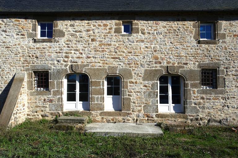 D'un point de vue extérieur la façade principale est composé au rez-de-chaussée de trois portes en anse de panier moulurées d'un tore sur l'arc et les piédroits. Les claveaux des deux portes sont frappés d'un écu portant l'inscription suivant : IERMENIER. D. M. 1558