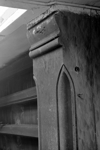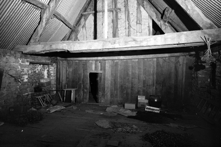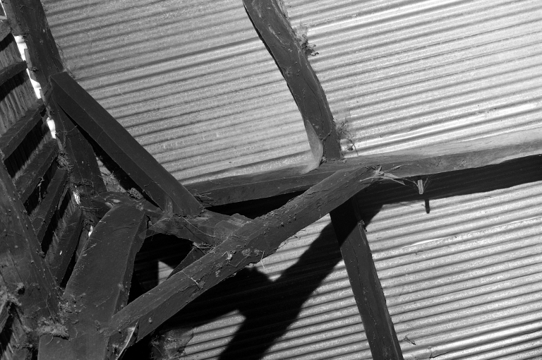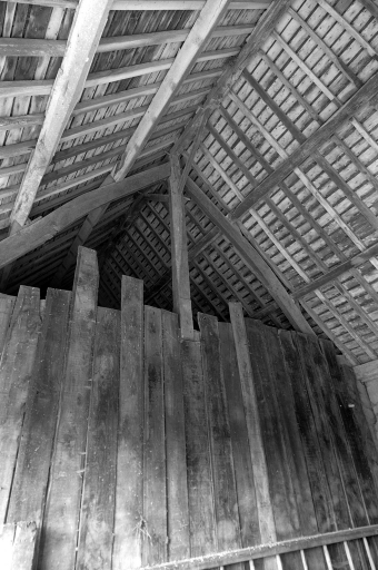 Le toit est à deux versants couvert d'ardoise et comportant un léger coyau. La charpente est construite portant pannes.