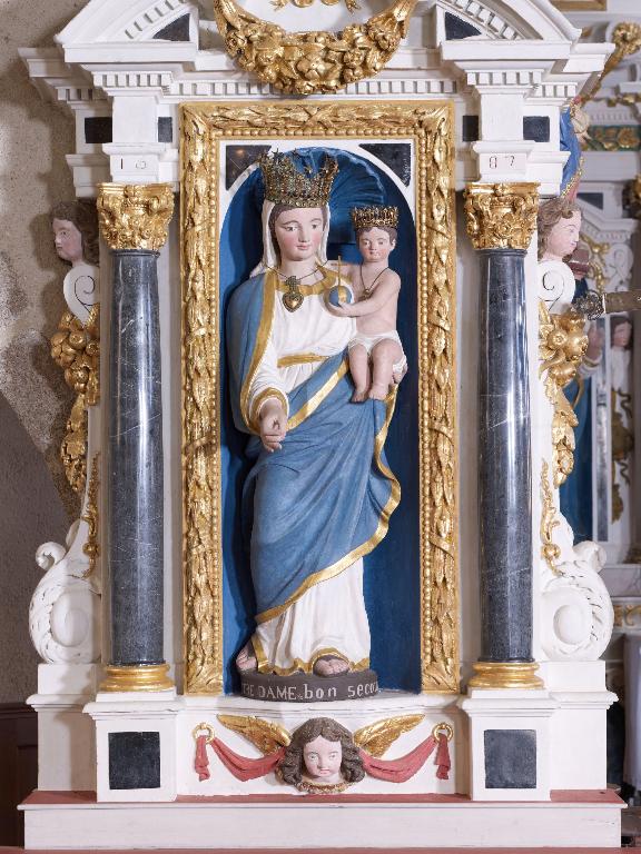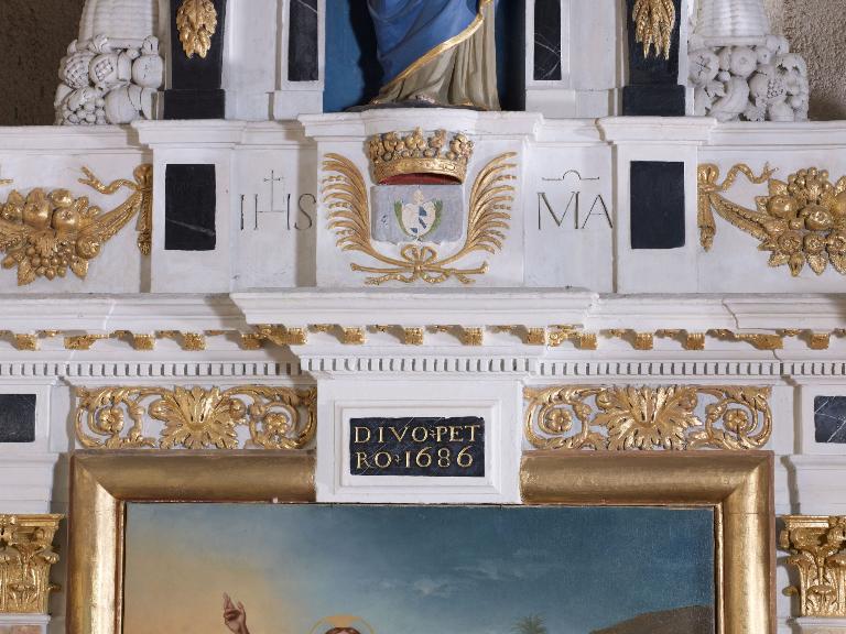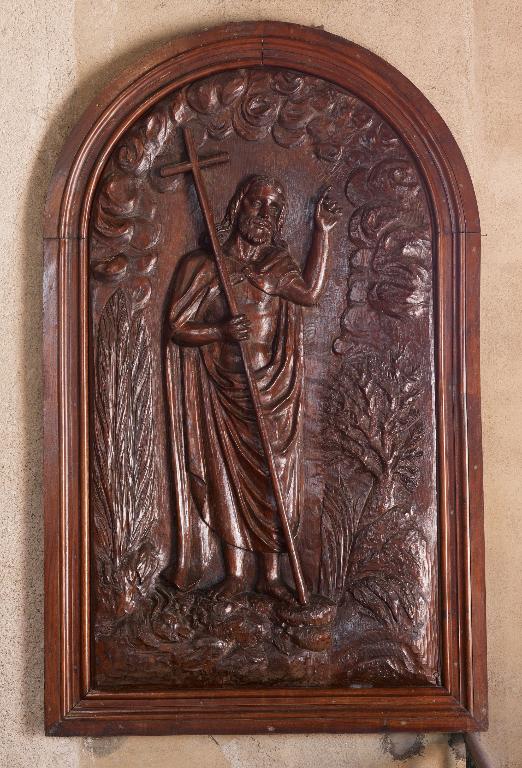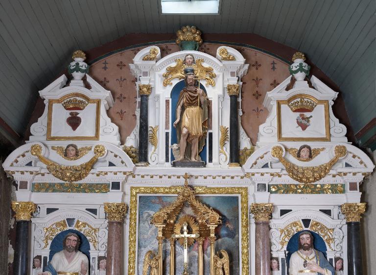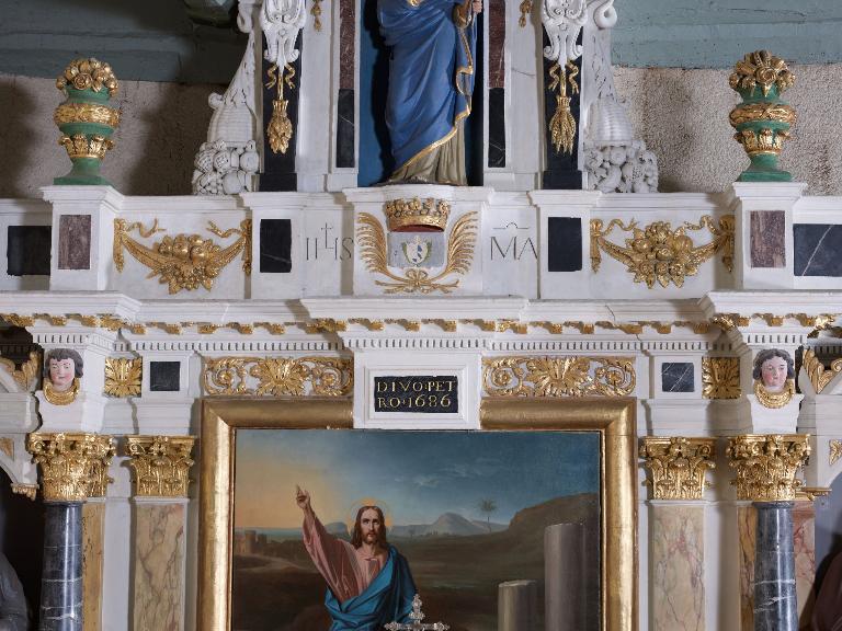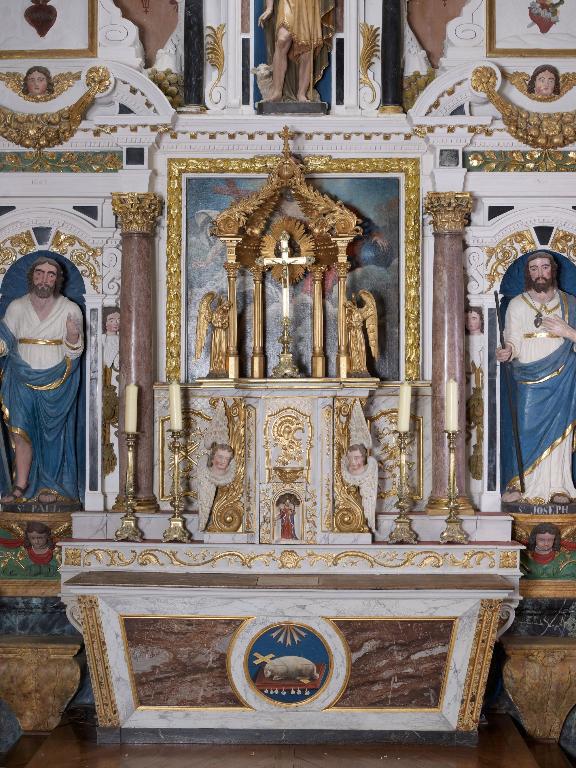 Les fonds sont décorés de deux panneaux en bois. On conserve dans l'église une croix professionnelle en cuivre du 17e siècle restaurée et classée Monument Historique. Elle présente d'un côté le Christ nimbé, et de l'autre une statuette dont il ne reste plus que le nimbe. La face principale était ornée de quatre petits cartouches figurant les quatre évangélistes et les animaux symboliques. Il ne reste plus que deux de ces cartouches.