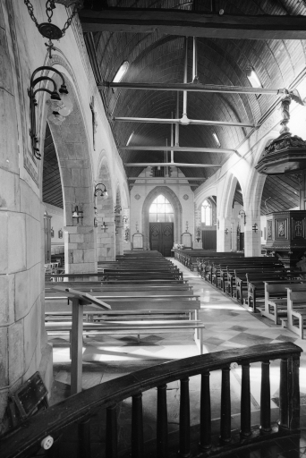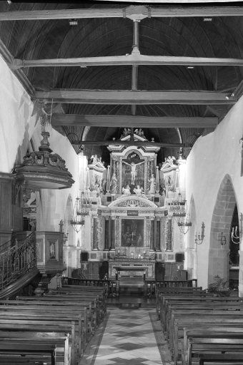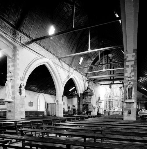 Plan allongé avec charpente en bois apparente et lambris de couvrement, clocher-porche en façade, porche latéral sud, chevet arrondi.