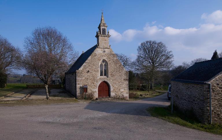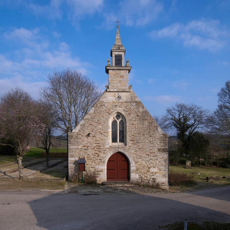 Chapelle érigée au 15e siècle : la charpente de la chapelle à poinçon bagué propose une datation du milieu du 15e siècle, confirmé par le remplage redenté du chevet. L'élévation ouest est modifiée dans sa partie haute probablement en 1906 : le clocher d'ardoise est alors remplacé par un clocheton de granite, entrainant la reconstruction du haut du pignon en pierre de taille ; c'est aussi à cette époque que la baie ouest et remontée et le remplage changé. Les armoiries figurées au-dessus de la porte du mur sud ont été bûchées à une époque indéterminée, peut-être à la Révolution.