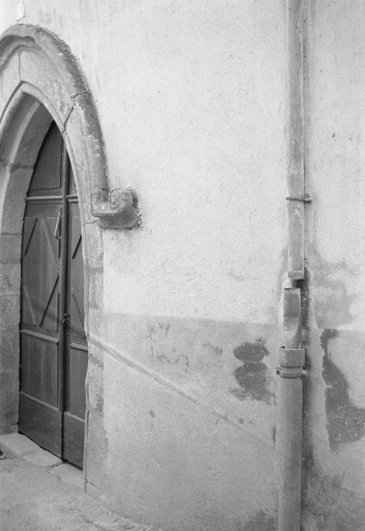* l'élévation antérieure est, irrégulière, comporte trois niveaux ; porte d'entrée en arc brisé moulurée de cavet et tore à base prismatique, archivolte à retours. Au deuxième niveau, une fenêtre ancienne moulurée (tore-cavet) avec trace d'un meneau. Au troisième niveau, une fenêtre moulurée de deux cavets, départ de meneau, trace de grille.