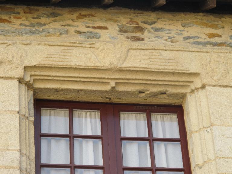 * l'élévation nord, partiellement masquée, a deux fenêtre moulurées ; l'une a son linteau orné de trois blasons martelés.