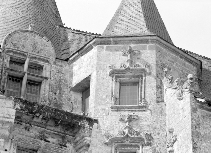 Saint-Guyomard. Château de Brignac. Tour ronde à mâchicoulis. Photographie, par Georges Estève, 1921.
