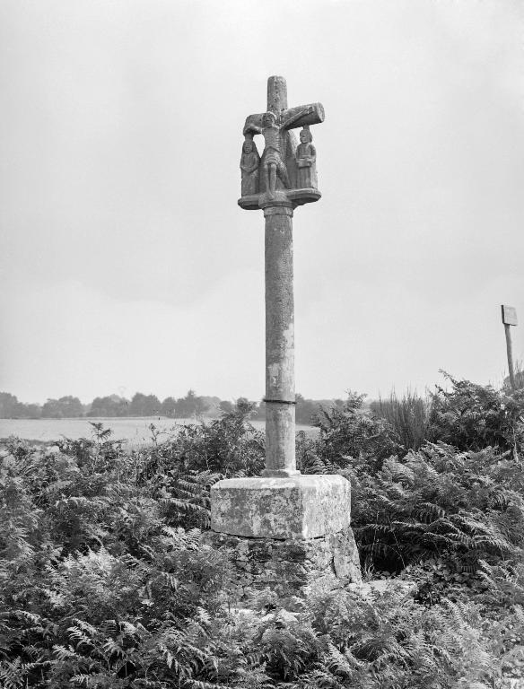 Croix monolithe, sur socle et soubassement de maçonnerie ; fût de section circulaire. Décor en ronde bosse ; sur une face : Calvaire ; sur l'autre face : Vierge de pitié.