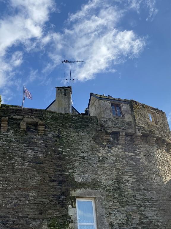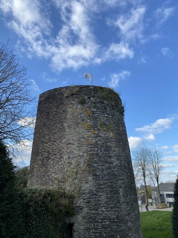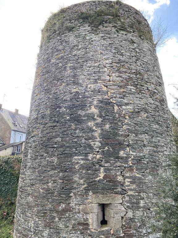 Ropartz cite également M. de Courcy : "Si cette enceinte a perdu ses trois portes, elle a conservé en grande partie des murs munis de mâchicoulis, ses douves et trois de ses tours. La façade ouest de l'église Saint-Armel touche aux remparts et à une tour, d'où les murs suivent la place Royale en se dirigeant vers la prison. C'est le front orienté à l'est que sont les fossés les plus profonds et une tour bien conservée à l'angle des courtines nord et est"... Leguay (op. cit., p. 284) et Bellevue (op. cit., p. 17) donnent un plan des fortifications.