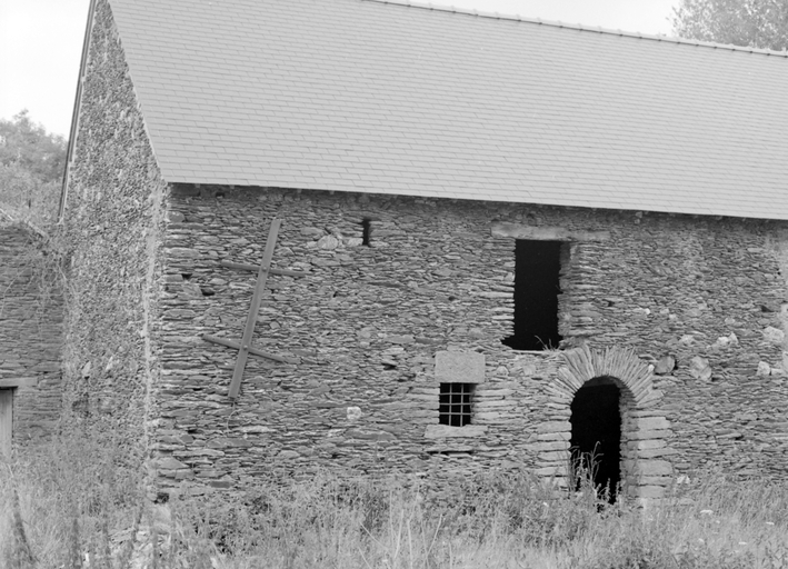 Au rez-de-chaussée, la partie "habitation" est surélevée, et ses murs sont enduits ; absence d'enduit intérieur à droite, qui signale un usage agricole qui pouvait être une étable : on aurait alors une maison à fonctions multiples, sans séparation, à porte unique en façade comme au Bois-Gicquel, sur la même commune.