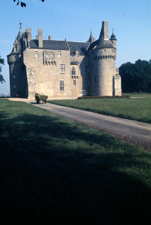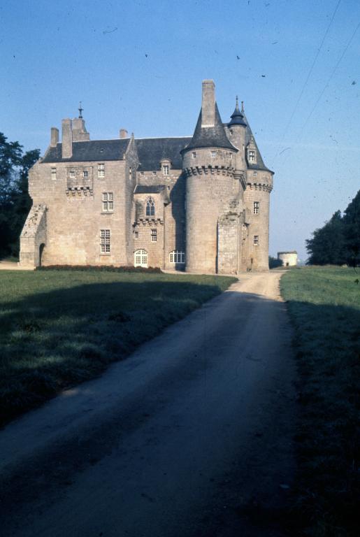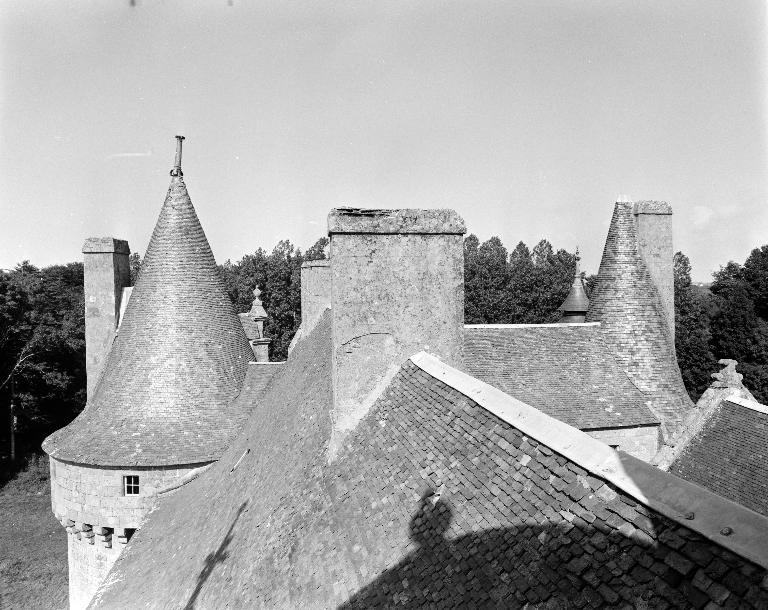 Château en pierre de taille de granite ; fontaine, puits, lavoir, colombier et ferme en moellon de granite ; marques de tâcherons.