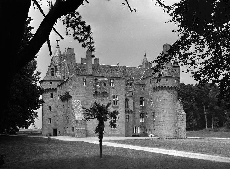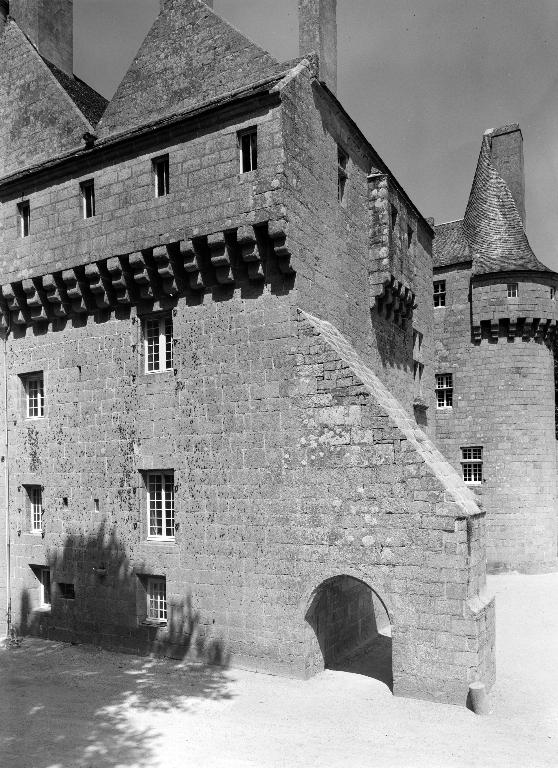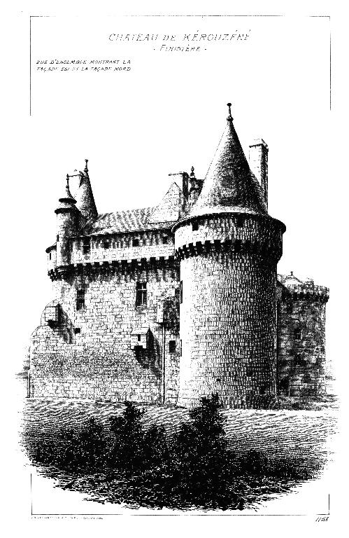 Château construit durant la 1ère moitié du 15e siècle pour Jean et Yves de Kérouzéré, fidèles des ducs de Bretagne. Siège lors des guerres de la Ligue en 1590 et destruction de la tour sud-ouest. Peintures murales du 17e siècle. Restitution de la toiture de la tour nord-ouest et restaurations à la fin du 19e siècle. Colombier du 15e siècle. Ferme, puits et lavoir du 19e siècle.