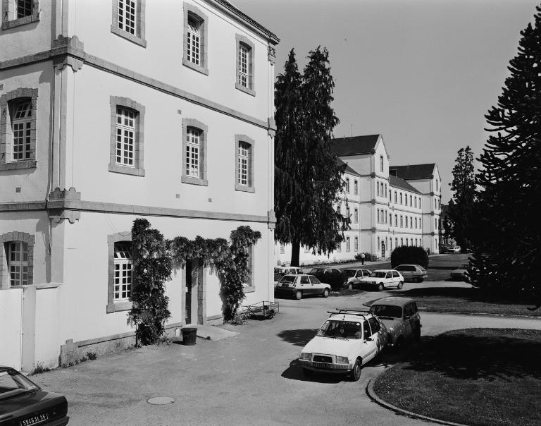 Plans établis en 1878 par Maigné, architecte départemental ; début des travaux en juin 1882 : construction de pavillons dortoirs, bâtiment administratif, cuisine, chapelle, bâtiment de bains, buanderie, ferme, atelier ; chapelle saint Jean de Dieu bénite en 1886 ; construction de deux pavillons supplémentaires pour femmes en 1889, pour hommes en 1894 ; agrandissement de la cuisiné en 1897 ; château d'eau construit en 1900 ; construction après 1899 de 2 bâtiments supplémentaires pour hommes et pour femmes ; construction d'une nouvelle buanderie en 1908 ; construction en 1909 d'un pavillon pour le médecin directeur ; 1932, 1933 : construction de nouveaux pavillons de soins ; 1935, 1936 : reconstruction de la cuisine ; construction de 2 citernes en 1950, d'un 3e château d'eau en 1953 ; construction d'un logement pour le directeur en 1952 ; construction d'une salle polyvalente en 1956 ; portail et grille transférés vers 1950 à Vannes rue Victor Hugo.