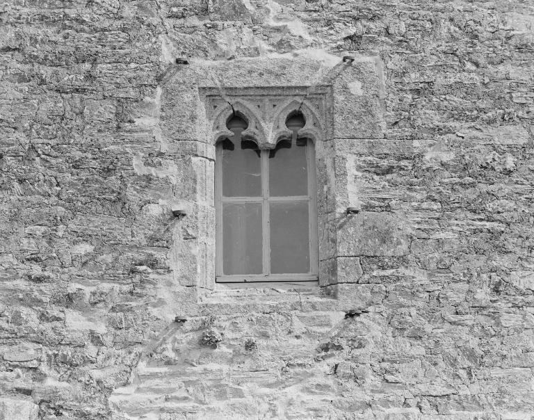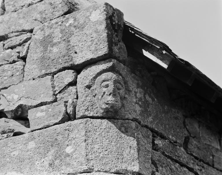 Sujet : fleur de lys, support : amortissement du larmier protégeant la toiture de la partie est ; sujet : tête humaine, support : angle nord-est de la partie est.
