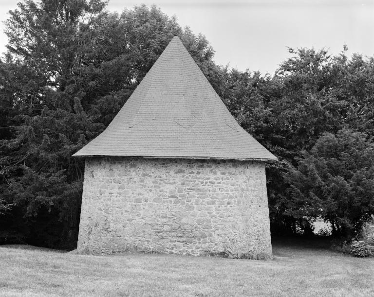 Communs est en moellon couvert en ardoise à pignon couvert, comble à surcroît, escalier de distribution extérieur, escalier droit ; colombier autrefois couvert en chaume toit conique, aujourd'hui couvert en ardoise toit polygonal ; poulailler couvert en chaume toit conique ; four à pain en moellon, toit à longs pans, pignon couvert, croupe polygonale ; logis en granite enduit, à un étage carré, toit à longs pans à pignon couvert.