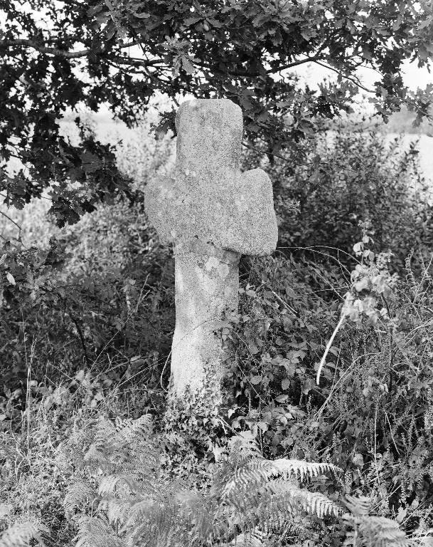Absence de décor ; les deux faces sont dressées mais assez frustres et légèrement bombées ; la section du fût, plus épaisse à la base est grossièrement rectangulaire ; épaisseur moyenne : 13 cm. La croix est plantée dans un socle monolithe en granite de faible hauteur (20 cm) posé à même le sol. Cassure cimentée sous les bras de la croix.