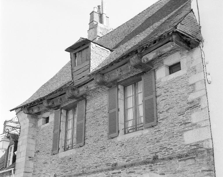 Maison construite entre 1500 et 1550 ; appelée en 1647 "Maison du chapeau rouge" et servant probablement d'auberge ; mutilée de moitié lors de la construction de la chapelle des Ursulines au milieu du 17e siècle ; suppression partielle du pan de bois au 19e siècle, remplacé par des moellons de schiste.