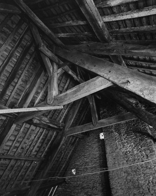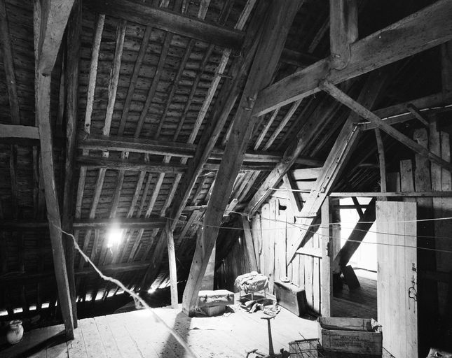 Élévation postérieure en pan de bois ; élévation antérieure en moellon de schiste remplaçant le pan de bois d'origine ; emplacement et forme de l'escalier d'origine inconnus.
