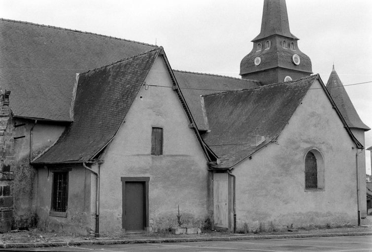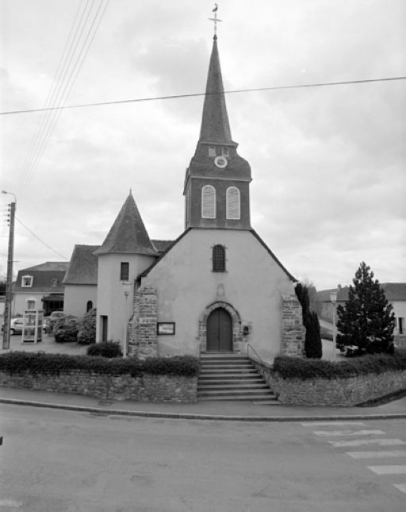 Église composée d' une nef à chevet droit de la fin du 15e siècle ou du début du 16e siècle. Transept construit aux 17e et 18e siècles par ajout de deux chapelles (une ardoise du faîtage du croisillon nord portait la date 1774, selon Banéat. Partie ouest de la nef refaite au début du 19e siècle, le clocher en haut de nef est alors déplacé. La tribune est réalisée par le sculpteur J.L. Brevet en 1839, une tour octogonale hors oeuvre permet d' y accéder. La fenêtre du mur est, a été refaite en 1885, au moment de la restauration de la verrière datée 1550.