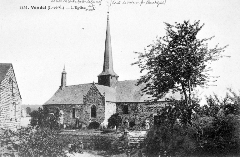 Eglise priorale fondée au 11e siècle par l'abbaye de Saint-Florent d'Anjou. La nef et le choeur conservent une charpente sur poteaux de bois que l'on peut faire remonter au 14e siècle. La chapelle sud peut dater du 16e siècle, sur son mur intérieur ouest a été dégagée une litre funéraire, en témoigne l'inscription portée : CETTE PARTIE DE LITRE FUNERAIRE FUT DECOUVERTE SOUS LE BADIGEON EN MAI 1924, LES ARMOIRIES SONT DE CHARLES DE LA BELINAYE SEIGNEURS DE LA PAROISSE DE VENDEL EPOUX DE MARIE DE BEAUCE MORT EN 1746. La chapelle nord qui lui fait pendant et forme transept a été construite en 1782. La façade ouest est reprise en 1840 (porte la date sur le bandeau horizontal) puis l'église est agrandie d'une sacristie vers l'est en 1857, par l'architecte Jourdin.