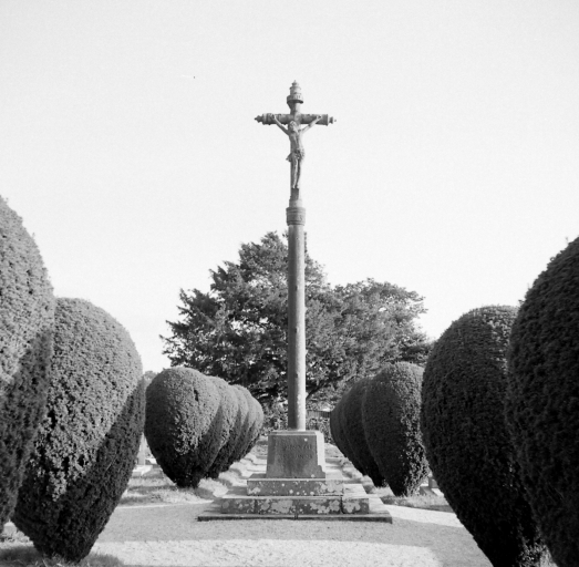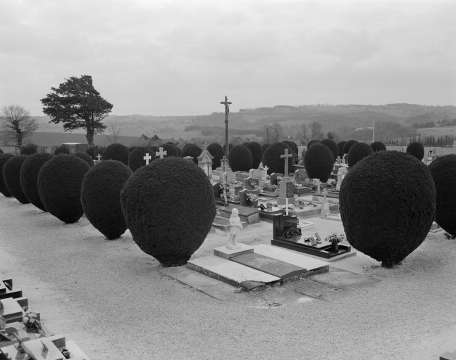 Cimetière transféré en 1873 (daté par source). Croix faite par Yves Hernot (signature) en 1873. Monument aux morts fait par F. Morvan (signature). Tombes faites par les ateliers Hernot, Balavoine, Morvan, Hue, de Saint-Brieuc.