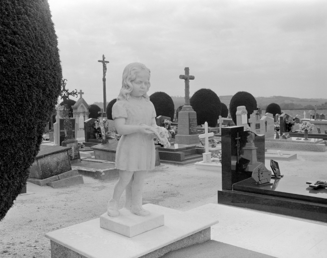 Christ en croix, support : croix de cimetière. Enfant sculpté en ronde bosse, support : tombe Beorghia-Jaglin.
