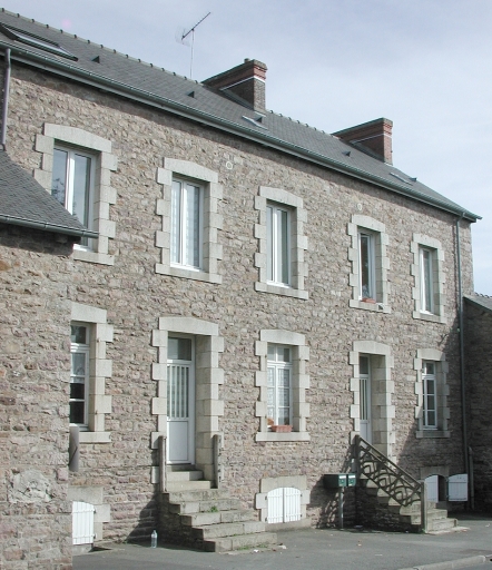 La partie habitation se compose d'une maison sur soubassement construite en grès pour le gros-oeuvre. Elle associe deux logis jumelés à double orientation, l'un à deux travées, l'autre de type ternaire. L'entrée de chaque logis est desservie par un un escalier droit en maçonnerie. L'encadrements des ouvertures est appareillé de granite clair en pierre de taille. L'utilisation et la mise en oeuvre du grès et du granite soulignent la composition de l'édifice et créent un effet de polychromie caractéristique. La partie scolaire se présente sous la forme d'un bâtiment de plan rectangulaire allongé, à treize travées.