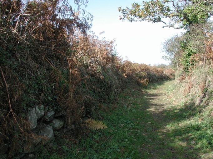 Chemin carrossable bordé de talus en partie appareillés de moellons de granite et de schiste, conservé sur une distance d'environ 600 mètres.