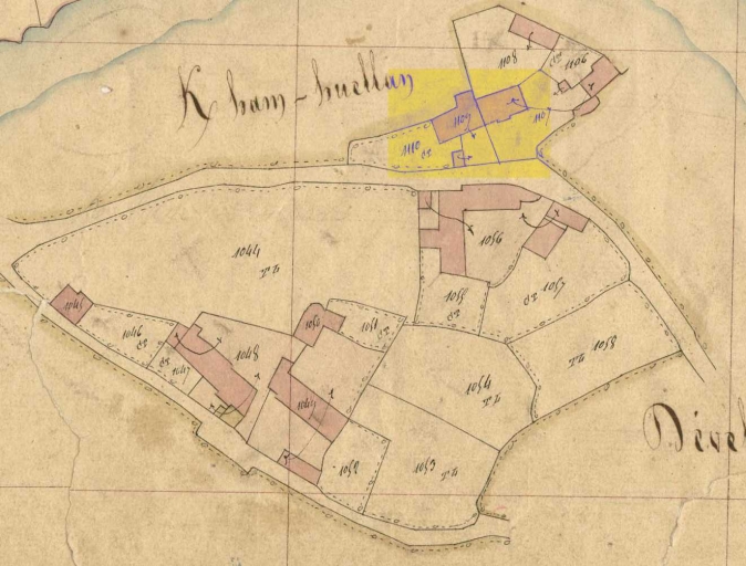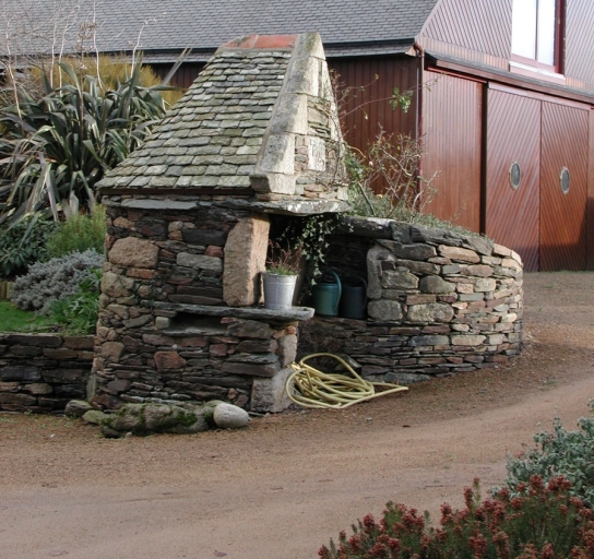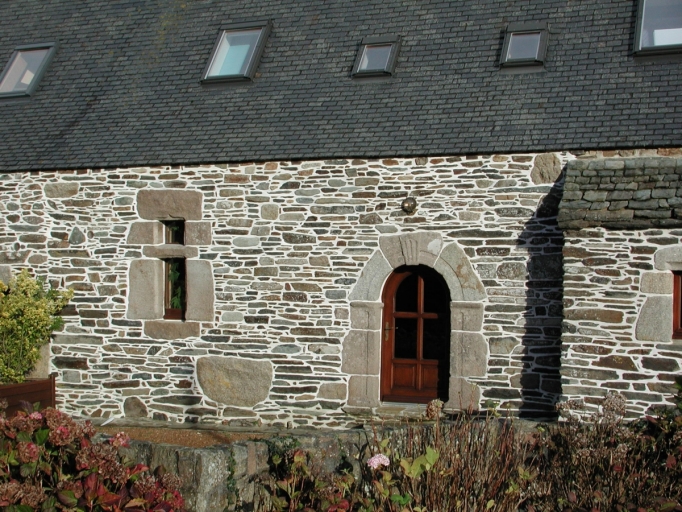 Edifice de plan rectangulaire allongé construit en granite et schiste, composé de deux parties inégales séparées par un mur de refend montant de fond en comble, correspondant probablement à l'origine à une étable (à gauche) et à un logis (à droite). Cette partie habitation présente une avancée à l'arrière ainsi qu'une légère avancée sous appentis à l'avant (kuz taol ?). On distingue également sur la façade antérieure la face extérieure d'un saloir en granite intégré au gros-oeuvre. Façade postérieure ouverte d'une porte en plein-cintre chanfreinée et façade antérieure ouverte également d'une porte en plein-cintre et d'une fenêtre à traverse. Eléments de décor : chanfreins, moulurations, fenêtre à traverse, accolades. Puits en granite et schiste couvert d'une croupe ronde (rapportée), à pignon du côté de l'ouverture présentant une pierre portant la date (1896), gravée d'une truelle et d'un marteau.