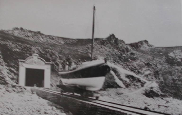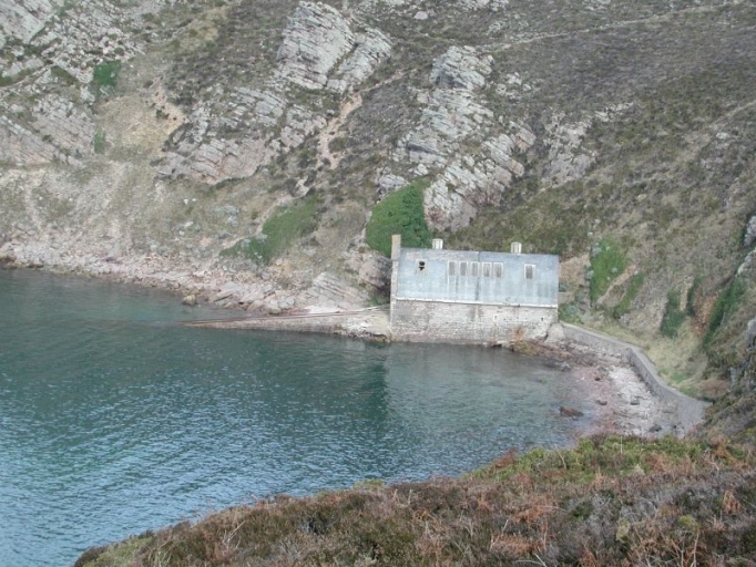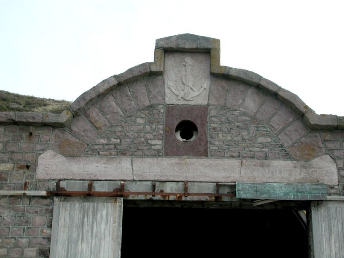 Le premier abri du canot de sauvetage mesurait 26 mètres de long et la cale environ 50 mètres. Le 2ème bâtiment pour l'abri du canot de sauvetage est un bâtiment rectangulaire, constitué d'un rez-de-chaussée avec une toiture voûtée. Les murs sont construits en moellons de grès cimentés (20 x 30 x 33 cm), avec une couverture en forme de voûte en béton armé, comprenant des verres encastrés, qui assurent l'éclairage à l'exclusion de toute fenêtre. La voûte est recouverte de toile goudronnée. Sept ouvertures sous la toiture apportent de la lumière. Un magasin à essence est édifié en dehors de l'abri. L'éclairage de nuit était assuré par un groupe électrogène. Un linteau en grès long de 6 mètres garnit le fronton de l'ouverture principale côté mer, avec une ancre de marine sculptée par Augustin Rault (père). Mesures du bâtiment : 15 mètres de longueur et 6 mètres de largeur intérieure, hauteur : 10 mètres. Une porte en bois ferme le bâtiment. La cale de lancement, équipée de rails de 158 cm d'écartement, a une longueur totale de 128 mètres. Elle est accessible à toutes les marées. La cale est éboulée à son extrémité. A l'intérieur du bâtiment, un chariot et un treuil rouillés. L'abri est prolongé sur sa partie sud-ouest par un mur de soutènement de 30 mètres de longueur en moellons de grès.