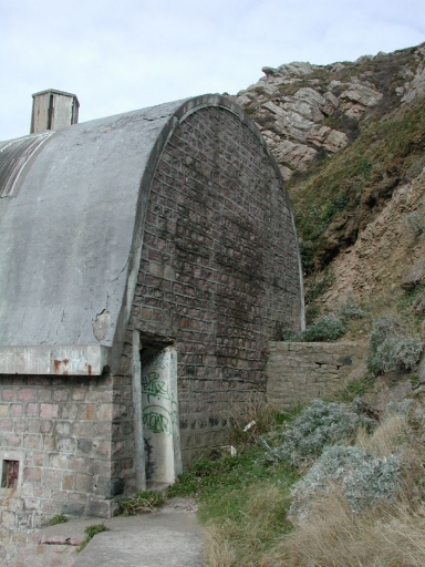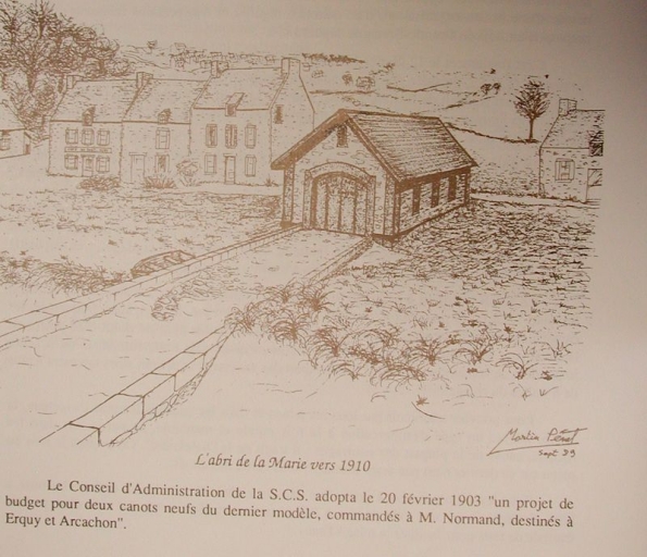 La première maison-abri, située en bout de jetée, au port d'Erquy, asséchant à marée basse, fut construite en 1903 et la concession liquidée en 1931 (dessin de Martin Pénet). Elle fut transférée en 1935 à la pointe d'Erquy. L'abri du canot de sauvetage, équipé d'une longue cale, est situé dans l'anse des Célezes-Port Blanc, sur le site du cap d'Erquy. Il a été construit en 1935 pour la Société Centrale de Sauvetage des Naufragés, sur les plans de l'architecte Jean Gagey (1933). Une route d'accès par le haut de la falaise et une rampe conduisant à la nouvelle station ont été aménagées par le Département et la commune d'Erquy. Sur le fronton, on peut remarquer une sculpture représentant une ancre, oeuvre du maître carrier Augustin Rault (père). Un phare de grande puissance était placé sur le fronton de la façade pour éclairer la cale. L'abri est désaffecté depuis 1966, date à laquelle le bateau de sauvetage "Vice-Amiral Courbet" fut envoyé pour réparation aux chantiers Brosselin à la Landriais. Cependant il ne revint jamais à Erquy. La cale subit des aménagements fréquents et fut allongée à plusieurs reprises. En 1965, des sondages révélèrent des fissures, qui la rendaient dangereuse pour les sorties à marée basse. Elle fut donc abandonnée. L'abri est aujourd'hui régulièrement "squatté" et subit des dommages. Le bout de la cale est endommagé. La déshérence du bâtiment participe de sa dégradation.