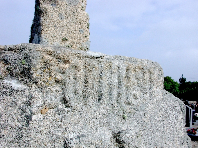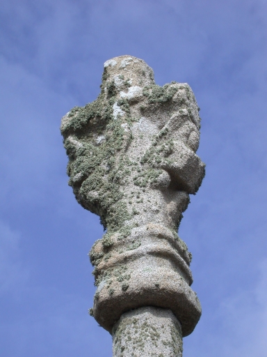Croix à haut fût monolithe sur socle et soubassement en granite. Elle est composée d'un soubassement formé par un emmarchement à trois degrés et d'un socle à griffes supportant un haut fût monolithe sommé d'une croix ornée d'un Christ en croix à l'avant, de deux anges tenant un livre dans leurs mains de chaque côté et d'une Vierge à l'arrière. Le socle est orné d'un calice et d'une bible à l'avant. Il présente une inscription à l'avant dont la lecture s'avère très incertaine et porte le millésime 1763 à l'arrière.