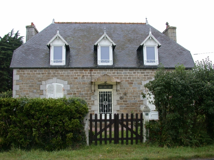 Maison de plan rectangulaire simple en profondeur construite en moellons de granite. Elle est composée d'un rez-de-chaussée à deux pièces et d'un étage de comble ajouré de trois lucarnes-pignon. La façade antérieure, montée en moellons de granite équarris, est ajourée de trois travées de baies régulières et présente une marquise au-dessus de la porte d'entrée. La toiture est sommée de deux épis de faîtage en zinc.