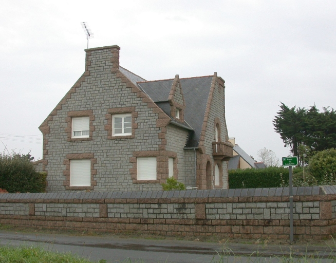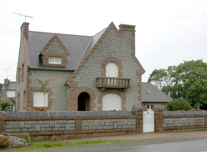 Maison de style néo-régionaliste construite en granite. Le gros-oeuvre est composé de moellons de granite équarris de couleur bleu-gris, les chaînes d'angles, les souches de cheminées, les rampants des pignons et l'encadrements des baies sont montés en granite rose. Conçue sur un plan à deux corps en équerre, elle présente en façade un mur-pignon latéral de forme asymétrique en raison de la présence d'un porche d'entrée à gauche. Eléments de décor : matériaux à deux tons, lucarne-pignon à crossettes, pignons découverts, balcon.