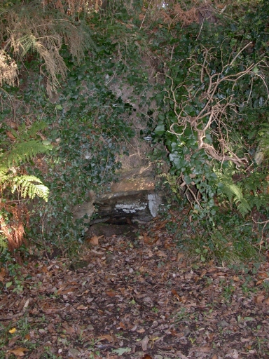 Fontaine à bassin carré, en maçonnerie de granite, engagée dans un talus en bordure d'un chemin carrossable.