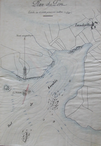 Cependant le débarcadère ne fut pas réalisé et les navires continuèrent à décharger leur cargaison sur la grève en employant des allées charretières. Sur un plan daté de 1907, extrait du plan cadastral de la commune, section B (fig. 14), on peut remarquer la présence d'un poste de douane à la pointe sud-ouest, la digue édifiée par Guillou au fond de l'anse de Keralies et les chemins non cadastrés, soulignés d'un trait rouge. La carte récente du SHOM permet de distinguer le balisage actuel et de remarquer l'absence d'ouvrage portuaire dans la baie de Keralies. La baie de Keralies s'ouvre vers les îles d'Erch, l'île Bihan et l'Île d'Aval (la seule habitée), qui fait l'objet au cours du 20ème siècle de campagnes d'extraction.
