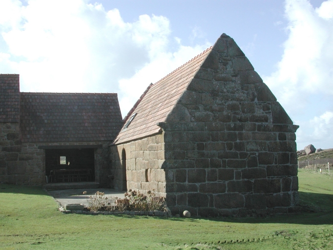 Le premier document graphique est le cadastre de 1819, qui montre les trois bâtiments A, B, C, implantés sur une même parcelle (certainement construits ensemble), le bâtiment D sur la parcelle voisine et deux petits édicules aujourd'hui disparus (indiqués P et S). On notera qu'à l'emplacement de la cellule antique, ne figure aucune indication de construction : la voûte à cette date, était effondrée, ne laissant que la base des murs côté ouest. Le corps de ferme comprend six éléments en continu, formant un plan en L (figure A, B, C, D, E, F) et la grange (G) datant du début du 20ème siècle. Les éléments les plus intéressants sont les cinq constructions principales (sur le plan : A, B, C, D, E). Le bâtiment A, le plus grand, situé à l'est, est sans cheminée tant dans le pignon est que dans le pignon ouest : il a dû servir d'étable. Sa construction a été faite en une seule fois : on ne décèle aucune trace d'adjonction ou de modification dans les façades. Lui est accolée dans son pignon nord et est, une cellule monastique, couverte d'une épaisse couche de terre sur 7 dalles horizontales, en granite, servant de couverture (mesures : 3, 50 m sur 4, 50 m de profondeur et 2 m de hauteur actuelle). Le bâtiment B, servant de grange à l'origine, édifice très remanié, a pu servir de logement par la suite : il s'est élargi dans la 2ème moitié du 19ème siècle, en alignant son mur ouest avec les murs des bâtiments C, D et E : une grande ouverture côté cour. Le bâtiment C était destiné au logement des fermiers, la grande cheminée existe toujours. Ces deux bâtiments B et ont été construits ensemble à la même date. Le mur ouest du bâtiment B a été remanié en 1986. Les bâtiments D et E sont postérieurs aux trois autres ("coup de sabre" ou joint vertical continu entre les deux murs, maçonnerie distincte en petits moellons). Les accès nord et sud sont traités avec des arcs en plein cintre. Le pignon du bâtiment E, surmonté d'un rampant contre lequel s'arrête la toiture, crossettes assurant l'arrêt de la corniche, copie les éléments caractéristiques des constructions anciennes. L'accès à la soue est à l'extérieur et le pignon sud laisse apparaître le four à pain. La couverture de ces bâtiments est en tuiles. Le nouveau bâtiment G mesure 7 m de large sur 20 m de longueur, avec plusieurs ouvertures à l'est, dont une grande porte de garage. Un escalier en pierre a été rajouté sur le pignon nord-est. La couverture est en ardoises.